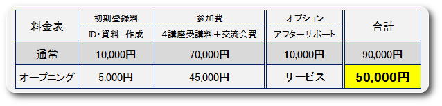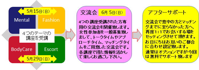 4つの講座受講された方専用の交流会を開催致します。女性参加者を 一般募集致しましてトークタイムやアプローチタイム、マッチングタイムをご用意した交流会です。各講座で得た情報を活かして楽しくお過ごし下さい |